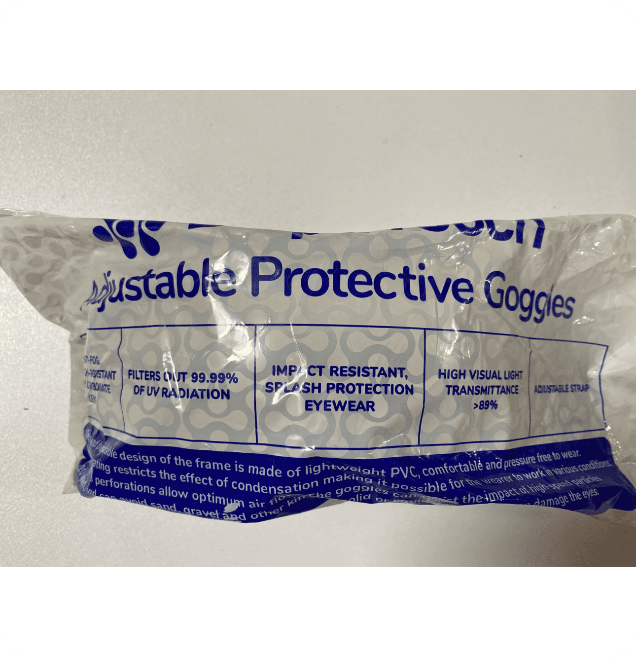 Adjustable Protective Goggles feature an anti-fog, scratch-resistant polycarbonate lens that filters out 99.9% of UV radiation. Lightweight and comfortable, these goggles provide splash protection, impact resistance, and can be worn over prescription glasses, making them ideal for various professional environments.