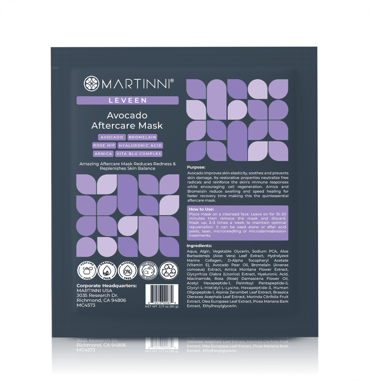 Indulge your skin with Martinni Beauty’s Avocado Aftercare Mask. This revolutionary treatment features an incredible blend of anti-aging ingredients that work to restore to a younger-looking complexion. Effectively reduces the depth of creases and shields the skin with antioxidants. Vitamin E and peptides boost collagen production, balance the skin tone and condition for a smoother texture. Hyaluronic acid hydrates, while Avocado extract neutralizes free radicals and reinforces the skin’s immune responses while encouraging cell regeneration. Complexion becomes smoother and brighter with a firmer and a more supple texture.