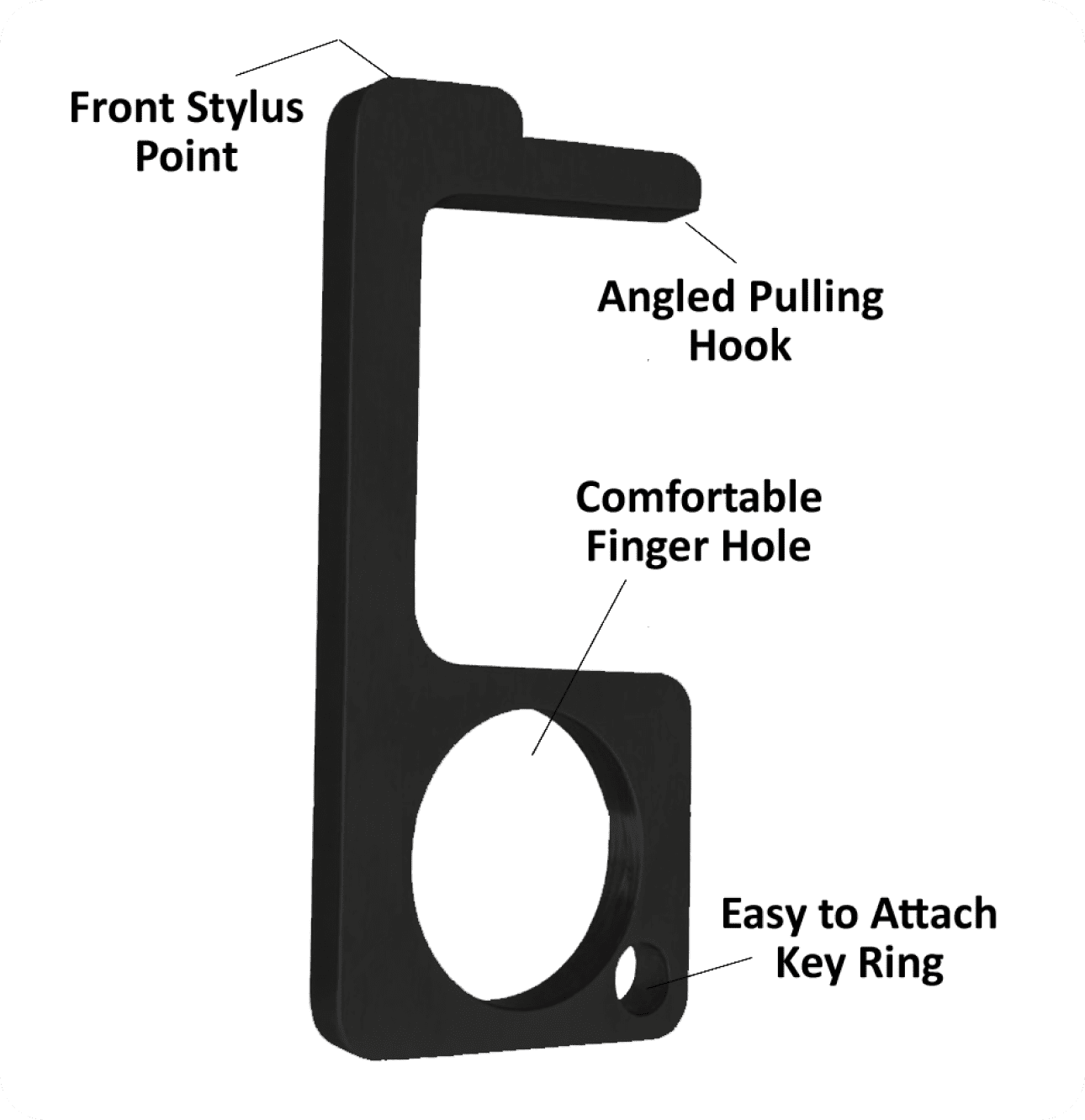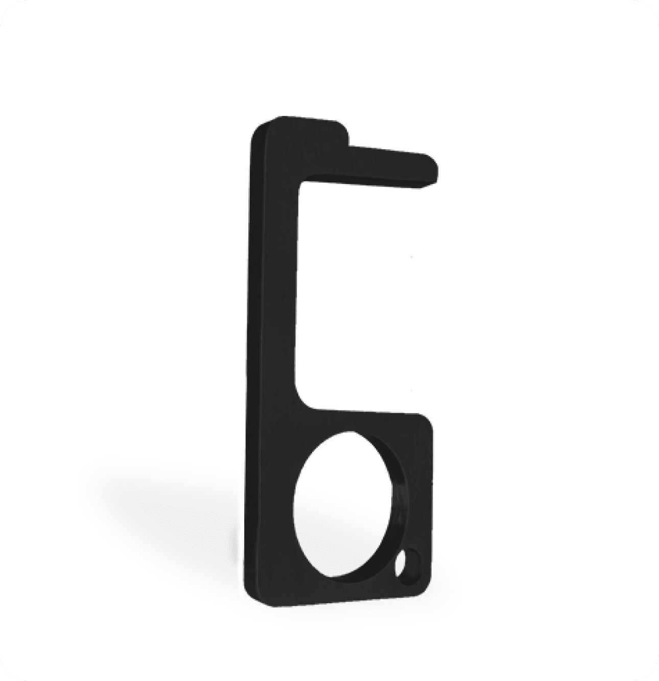 The CleanKey (Gun Black) is a no-touch hygiene tool designed to safely interact with external objects like door handles, elevator buttons, and ATM keyboards. Featuring a copper construction with antimicrobial properties, it includes a stylus tip and wide finger hole for comfort and efficiency.